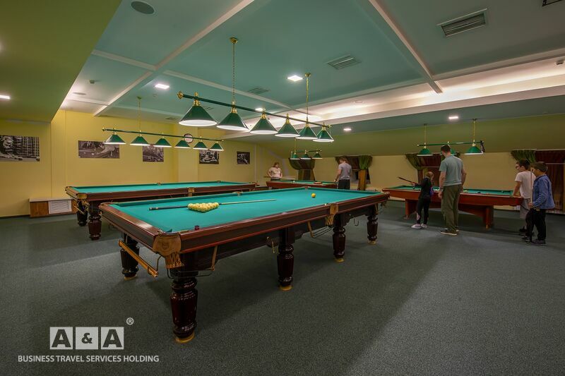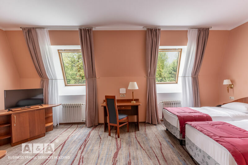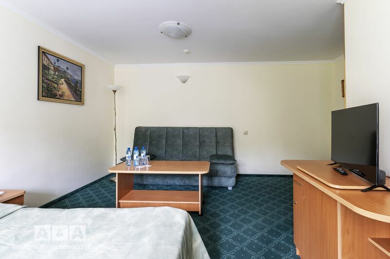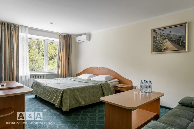 две полуторные кровати, двуспальный диван, журнальный и письменные столы, шкаф-купе, прикроватные тумбочки, полка для багажа и обуви, телевизор, мини-бар, телефон, кондиционер, проводной интернет-бесплатно.