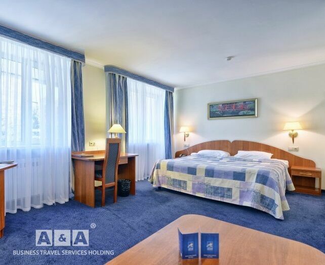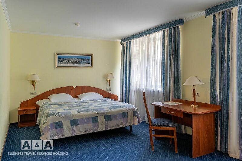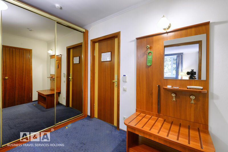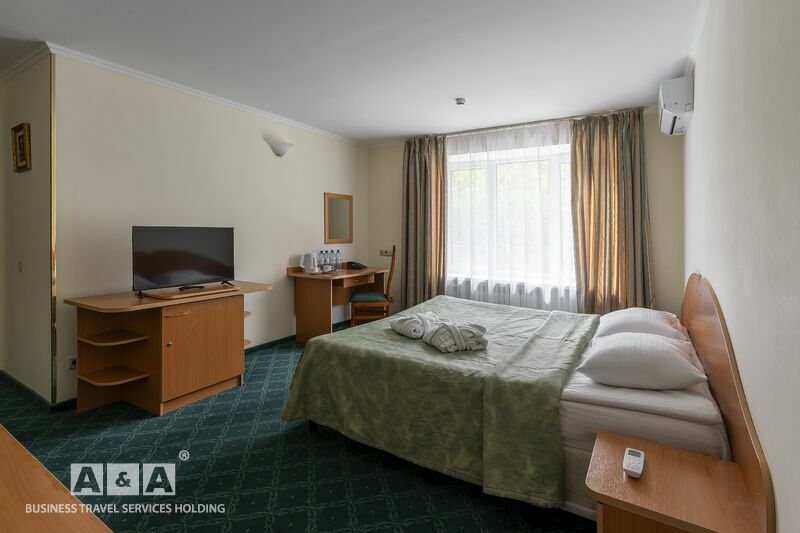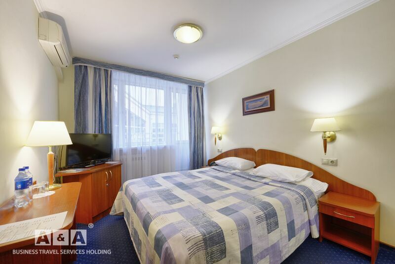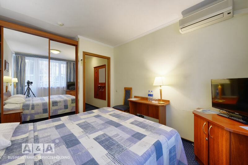 двуспальная кровать, шкаф-купе, прикроватные тумбочки, телевизор, полка для багажа и обуви, мини-бар, телефон, кондиционер, проводной интернет - бесплатно.