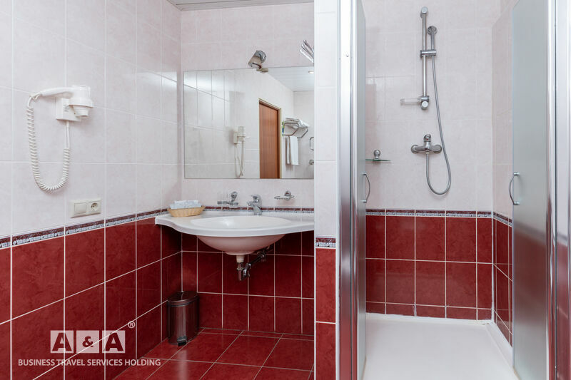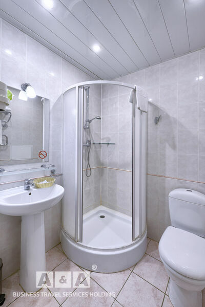 унитаз, душевая кабина, умывальник, комплект полотенец, туалетные принадлежности, фен.