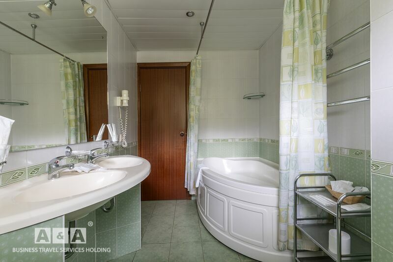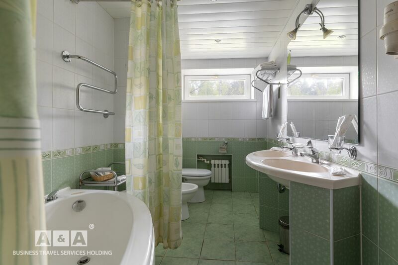 унитаз, биде, ванна-джакузи, умывальник, банные халаты, тапочки, комплект полотенец, туалетные принадлежности, фен.