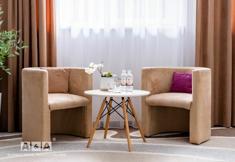 В номере удобная мебель: двуспальный диван, удобные современные стулья, большой шкаф-купе с зеркалом во весь рост, журнальный столик; белоснежное постельное белье, кондиционер, телевизор, мини-холодильник, душ и санузел в ванной комнате, махровые полотенца и халаты, душевые одноразовые принадлежности, фен, сейф, брендированная бутилированная вода, приветственный набор (утренний), бесплатный чай и кофе, а также бесплатный Wi-Fi.