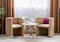 В номере удобная мебель: двуспальный диван, большой комод, удобные современные стулья,
