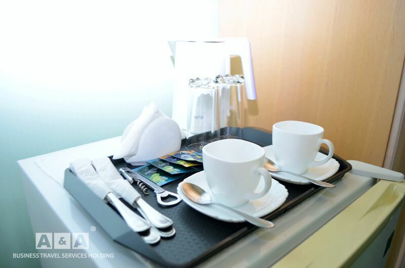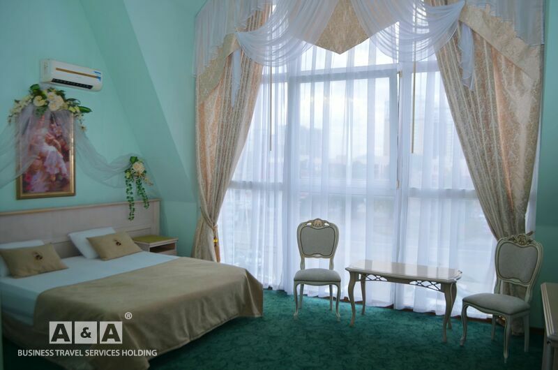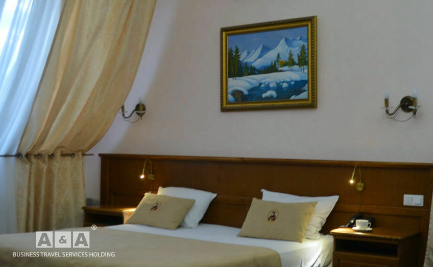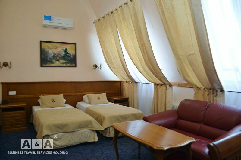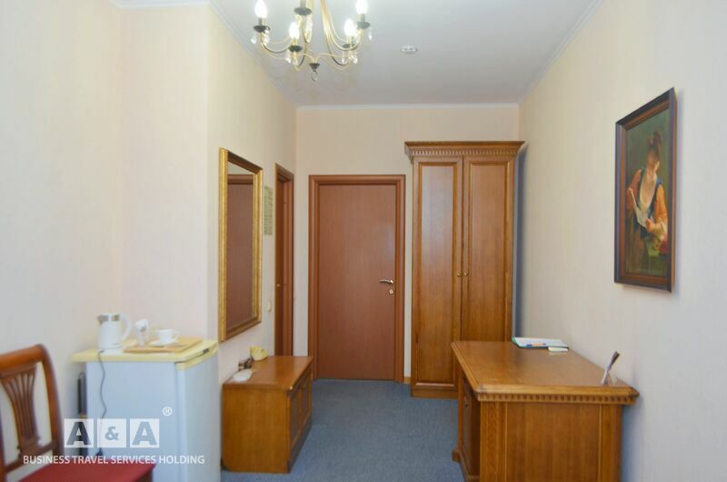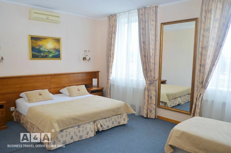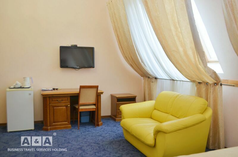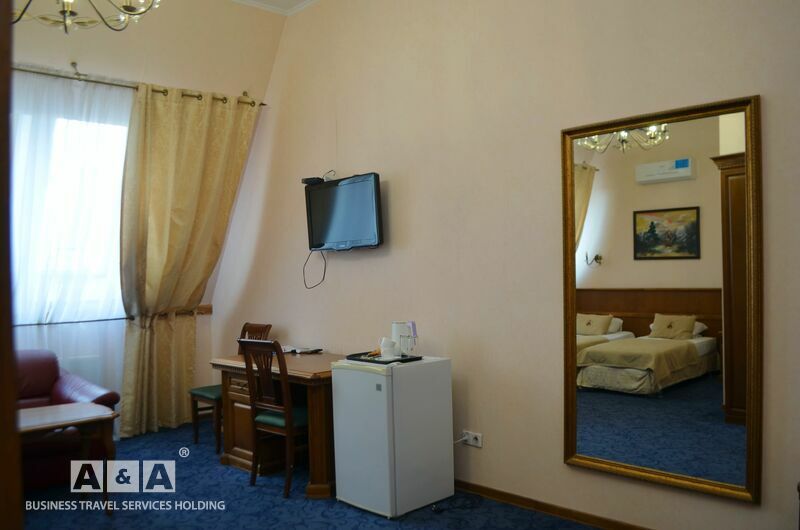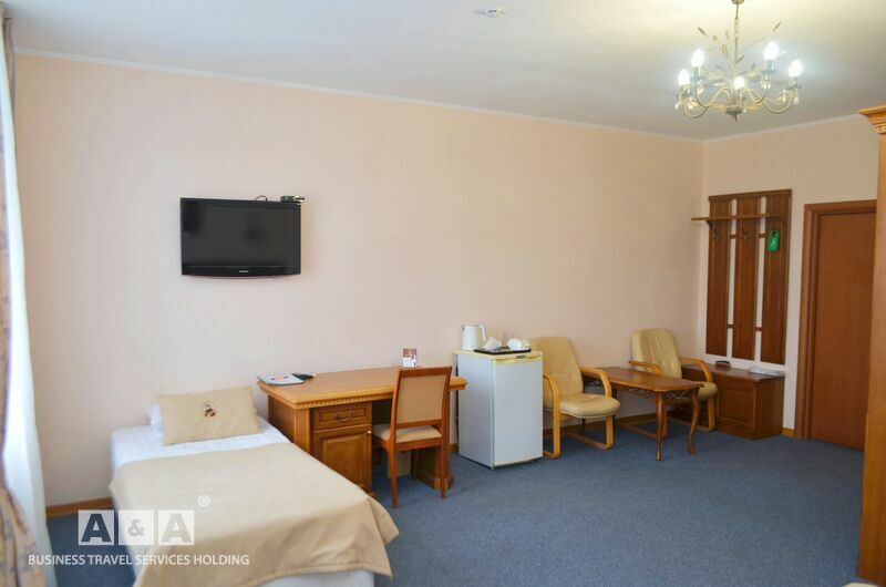 В номере: кровать (1,6*2,05), при необходимости 2 кровати (0,80*2,05), мебель из натурального дерева, рабочий стол, Wi-Fi, зона отдыха, централизованное кондиционирование, телевизор, международная связь, холодильник.-