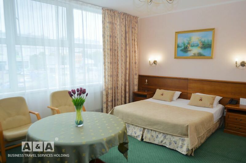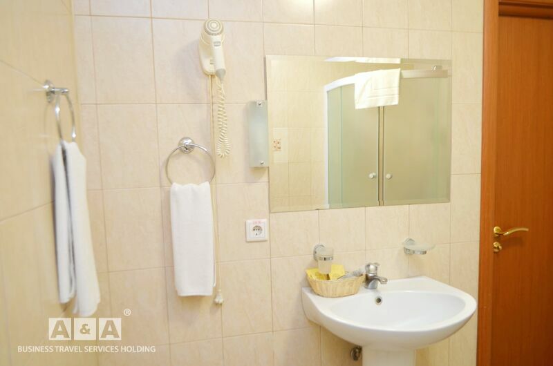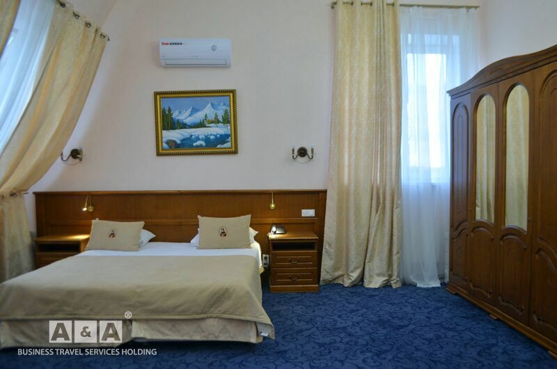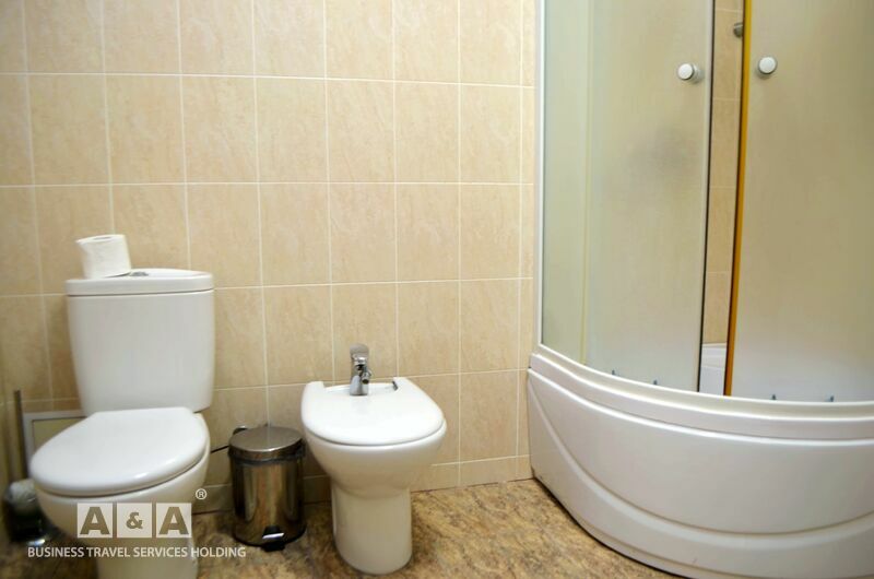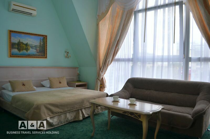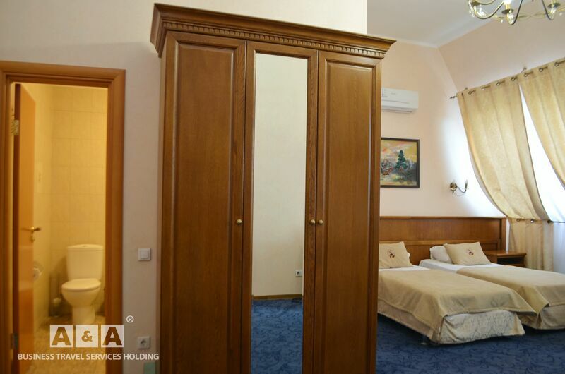 В номере: мебель из натурального дерева, двуспальная кровать(1.6*2,05) или 2 односпальные кровати (0.8*2.05), раскладной диван , рабочий стол, большое зеркало. Wi-Fi, Сплит - система, телевизор, холодильник. В ванной комнате: душевая кабина, биде , фен, предметы личной гигиены.