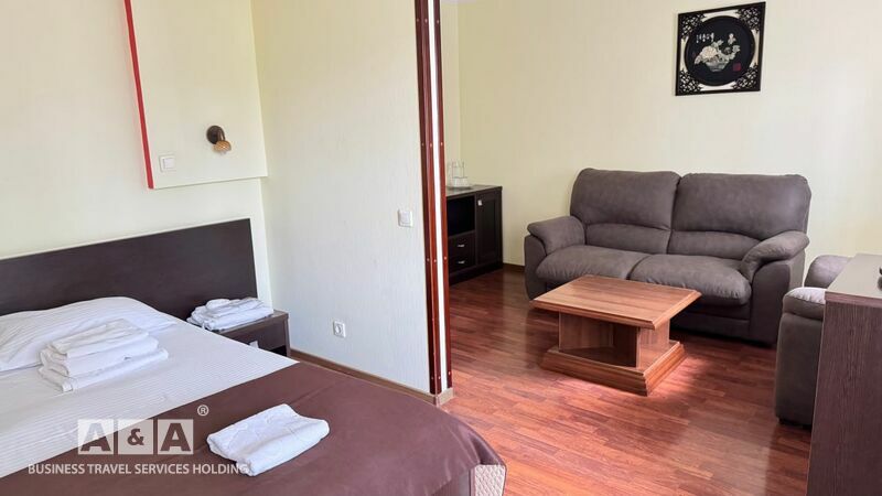 Удобный номер, состоящий из прихожей, спальной комнаты и ванной комнаты.