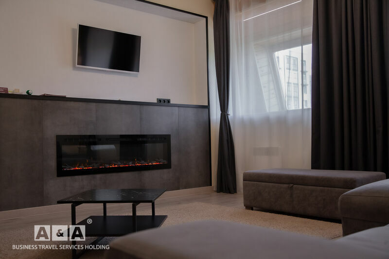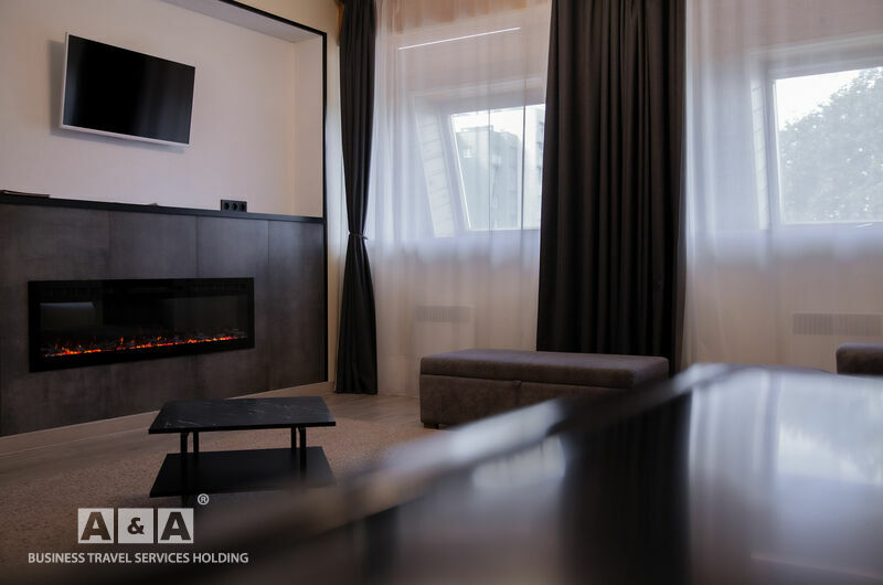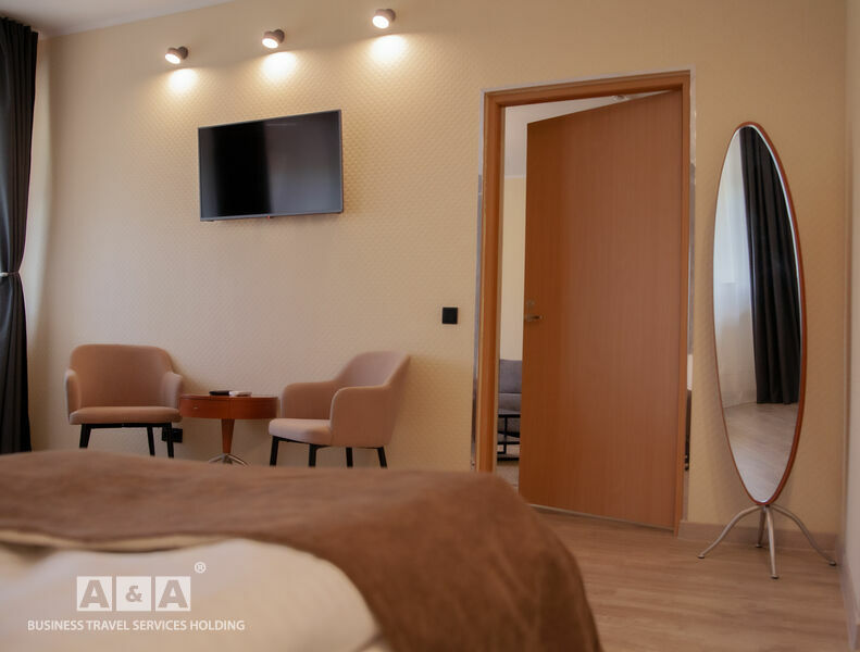 Две 1,5-спальные кровати, шкаф-купе, телефон, высокоскоростной Интернет (Wi-Fi), ЖК телевизор (спутниковое телевидение), рабочий стол, кондиционер, холодильник, индивидуальная система отопления, ванная комната (душ), фен.-
