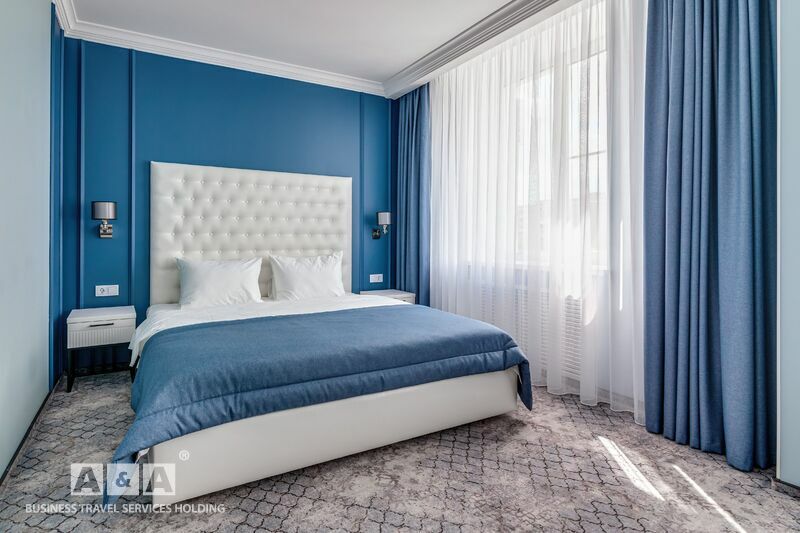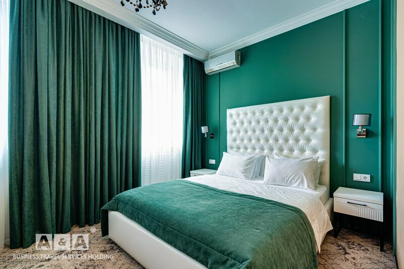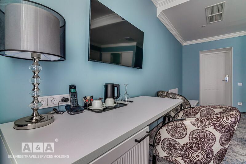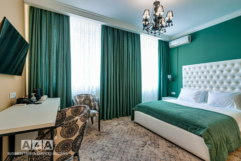 Оснащение номера: двуспальная кровать, ванна, ЖК-телевизор, фен, махровый халат, тапочки (по количеству гостей), кондиционер, холодильник, шкаф, зеркало, мягкая зона, средства индивидуального пользования (крем мыло, шампунь гель, молочко для тела, шапочка банная, зубной набор), бутилированная минеральная вода в номере. Завтрак "шведский стол" включен в стоимость проживания.
