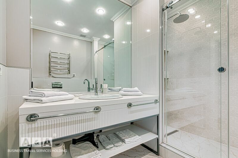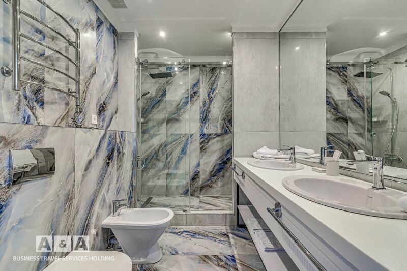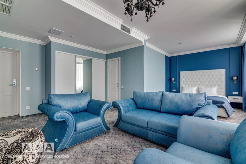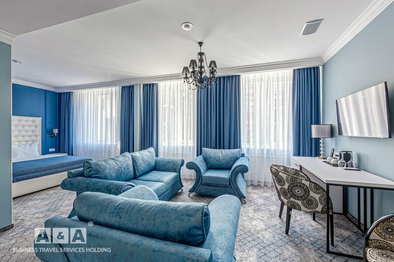 Прекрасно подходит для деловых людей. Благодаря гостиной зоне в номере можно проводить небольшие совещания с коллегами или пригласить гостей поужинать в уединенной обстановке. Оснащение номера: двуспальная кровать, мягкая зона, кофейный столик, ванна, беде, 2 раковины, ЖК-телевизор, фен, махровый халат, тапочки ( по количеству гостей), мини-бар (однократное пополнение), средства индивидуального пользования (крем мыло, шампунь гель, молочко для тела, шапочка банная, зубной набор, бритвенный и косметический набор) , бутилированная минеральная вода в номере, шкаф, кондиционер