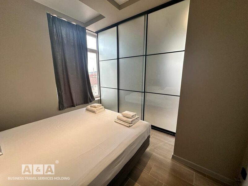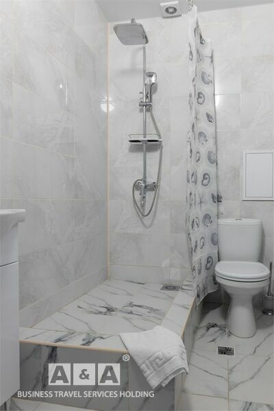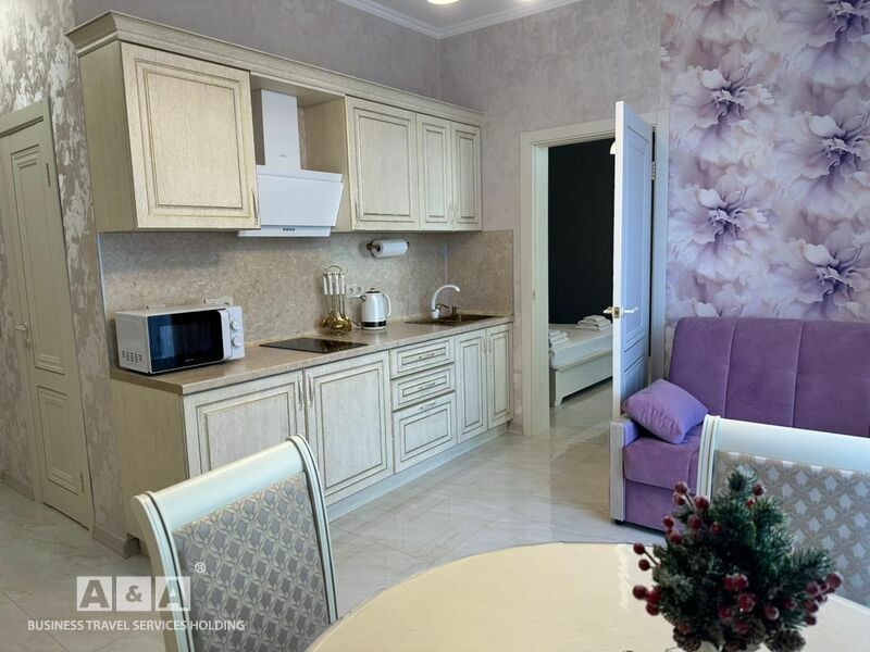2 комната – большой раскладной диван, 2 мягких кресла, журнальный стол, телевизор, холодильник, шкаф, багажная тумба. Ванна, раковина, унитаз, фен.