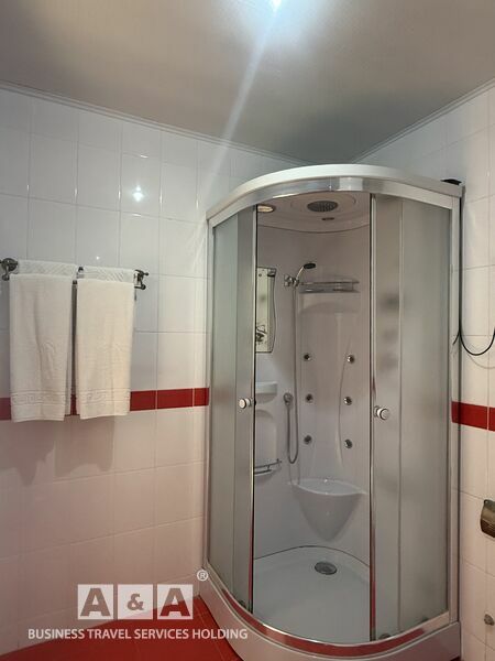 В ванной комнате:душевая кабина,банные принадлежности,тапочки,туалетные принадлежности,