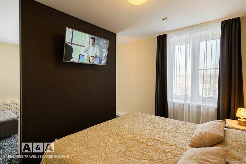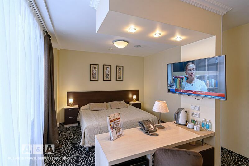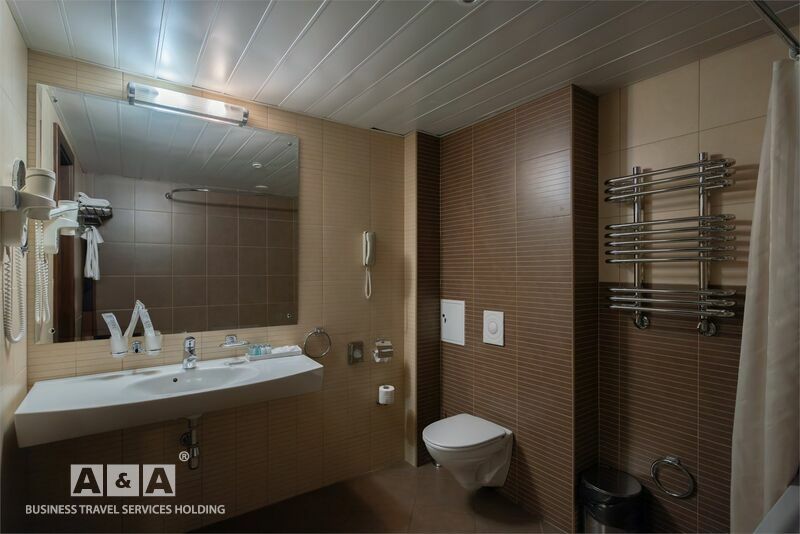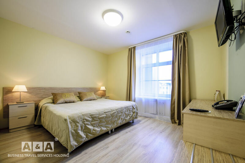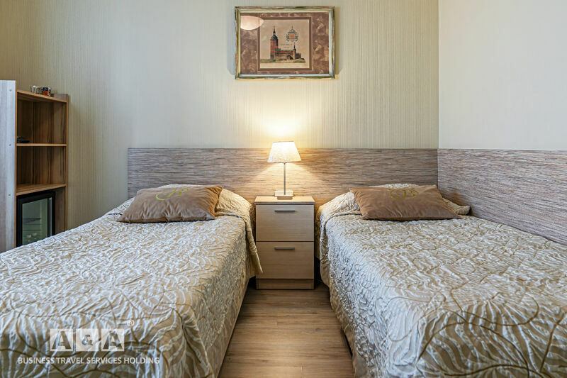 - Площадь номера 17 кв.м. В номере 2 односпальные кровати ( при необходимости возможно соединение в одну кровать), прикроватная тумба, рабочий стол, пуф, платяной шкаф, в некоторых номерах малый 2-х секционный шкаф, подставка под багаж, зеркало во весь рост с вешалкой для верхней одежды, сейф, минибар, ЖК ТВ (спутниковое ТВ) , проводной Интернет, телефон, ванная, фен.