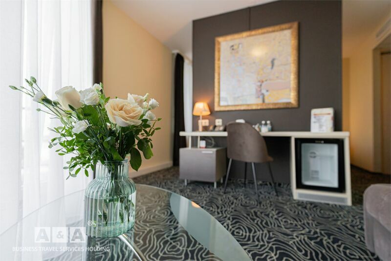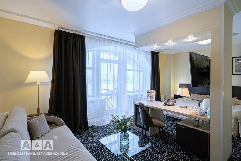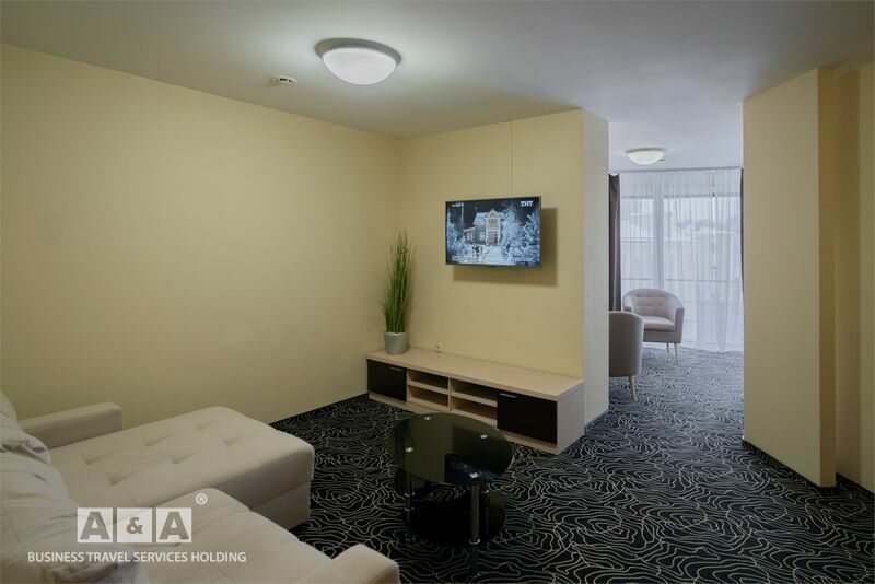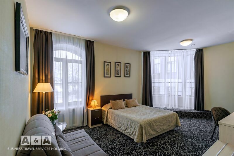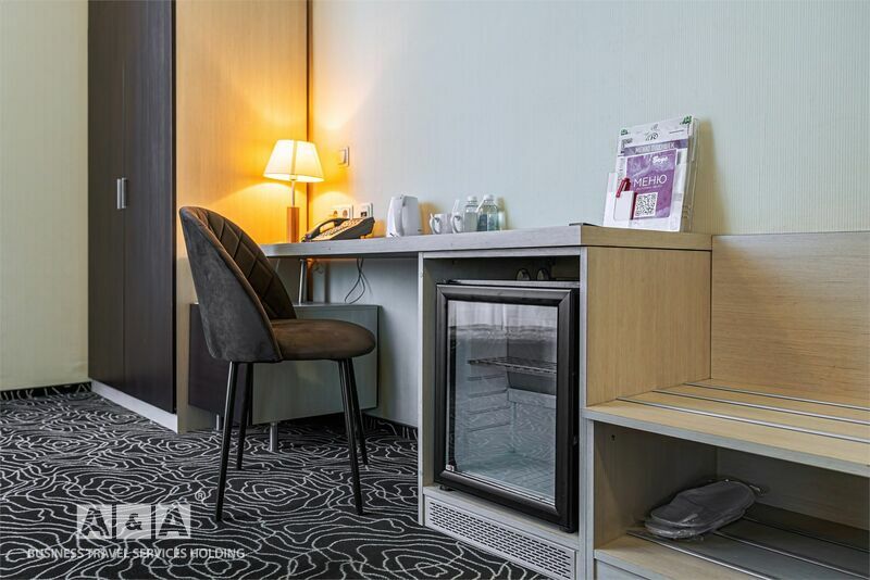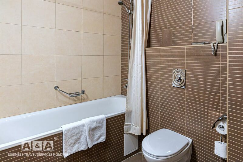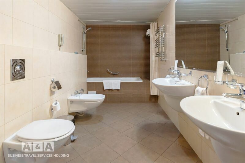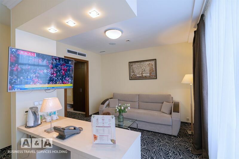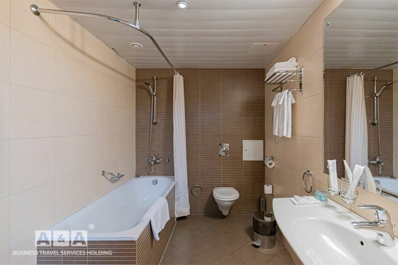 - Площадь номера 42 кв.м. В номере 2 односпальные кровати, 2 тумбы, рабочий стол, стул, диван (возможно использование как дополнительного спального места), 1 кресло, низкая тумба, малое зеркало, платяной шкаф, зеркало во весь рост, вешалка для верхней одежды с подставкой под багаж, сейф, минибар, ЖК ТВ (спутниковое ТВ), проводной Интернет, ванная, фен, телефон в ванной.