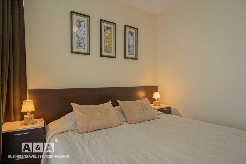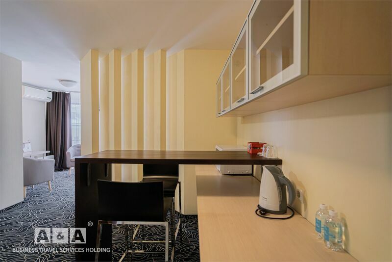 - Площадь номера 52 кв.м.. В номере 2 односпальные кровати, 2 тумбы, рабочий стол, стул, малое зеркало, кресло, угловой диван (возможно использование как дополнительного спального места), низкая тумба, барная стойка с 2 стульями, кухонным гарнитуром, эл. чайником и микроволновой печью, платяной шкаф, зеркало во весь рост, вешалка для верхней одежды с подставкой под багаж, сейф, минибар, два ЖК ТВ см(спутниковое ТВ), проводной Интернет, ванная, фен, телефон в ванной.